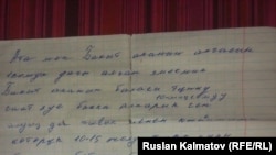 В предсмертной записке говорилось: «Папа, я не украл ни сома у Бакыта байке. В два часа ночи сын Бакыта байке повел меня к деревьям, раз 10-15 ударил прутом, потом пять-шесть раз ударил по голове и лицу, у меня потемнело в глазах. Я подумал, что он меня убьет, и вынужден был признать вину… Это письмо я оставил не только вам, но и еще 2-3 людям. Папа, я жду только приезда мамы, если она приедет через 2-3 дня, мне бы ее только увидеть один раз. Я заставлю их заплатить 100 тысяч сомов за мои 3500 сомов и ваши 10 тысяч сомов. Не ищите меня в другом месте, вы найдете меня в доме Бакыта байке. Мое последнее слово: я чист».