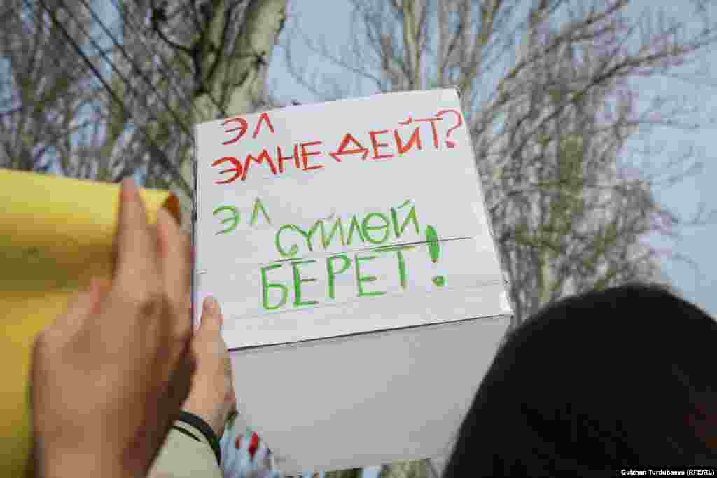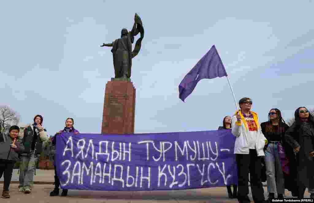 В Бишкеке 8 марта в Международный женский день прошел марш за права женщин. Шествие под лозунгом «Жизнь женщины – зеркало времени» началось от памятника борцам революции на проспекте Чуй и завершился в сквере имени Горького по улице Исанова.
