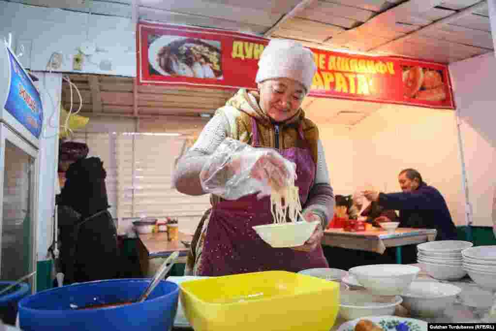 Эльвира за день продает 100 порций ашлямфу. В теплое время года продажи в два раза выше. За этими цифрами стоит огромный труд. Лапшу Эльвира варит ранним утром, а поздно ночью, после тяжелого трудового дня на рынке она готовит соус. Секретам приготовления аутентичного караколького ашлямфу женщина научилась у своей матери.